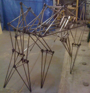 In the spring of 2011 I had the legs nearly dialled in and the frame made in 3 large parts that could be pulled apart or pinned together allowing for easy transport on a truck. Over the summer I added a sound system and took it to the first Maker Faire in Vancouver. I called it Panterragaffe, because the word didn't exist on Google and I thought it would be a cheap way of tracking it's spread across the Web.