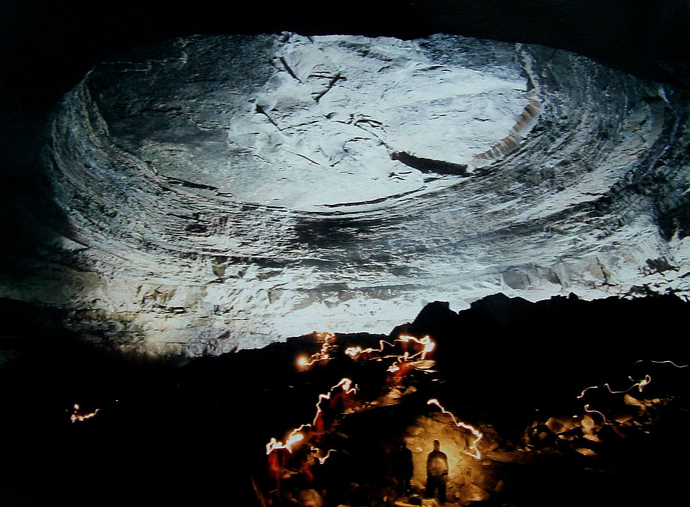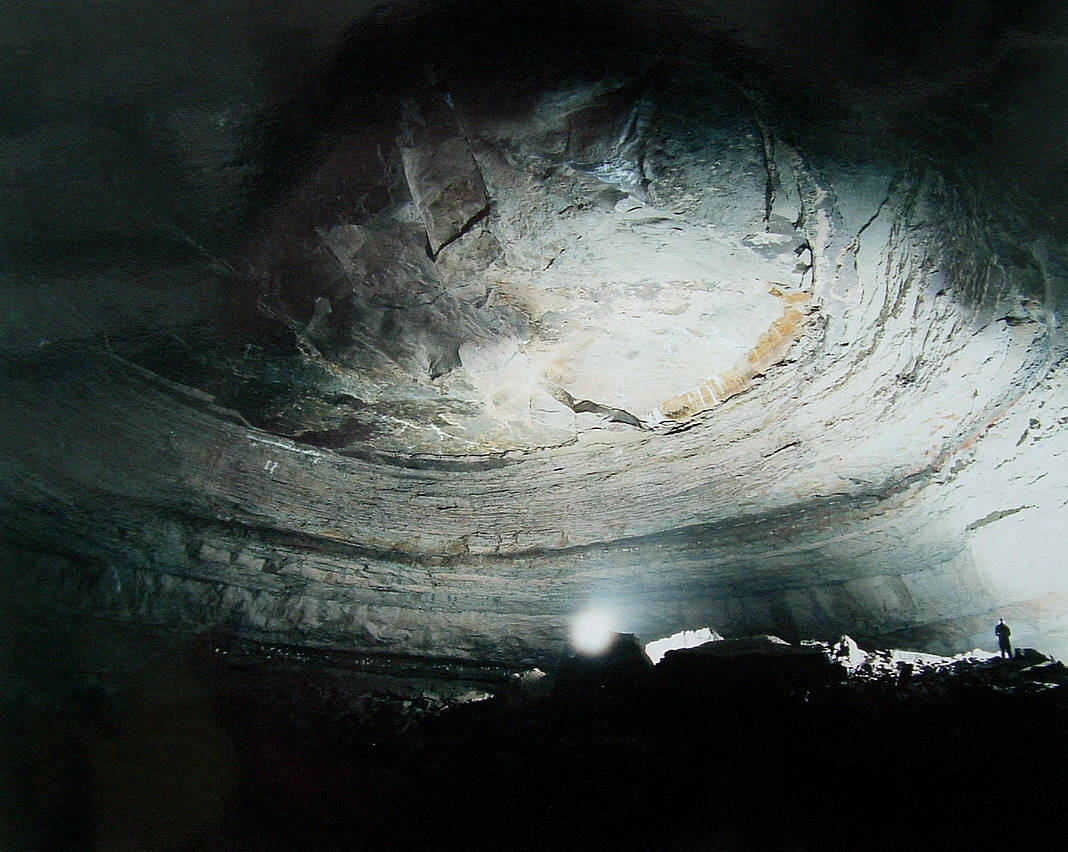 In this image, the camera is positioned at the base of a huge pyramid of rubble about 7 stories tall. Two friends are standing up there shooting strobe lights multiple times during a long time exposure to illuminate the ceiling, which is about another 5 stories higher. This room is the third in the series of large chambers in this cave.   At the time this image was taken, fewer than 30 people had stood in this place and none had seen it with as much detail as in this photo.   I’m using my widest lens and the camera is pointing up at a 45 degree angle. The room is large enough to contain a small city block including the buildings.